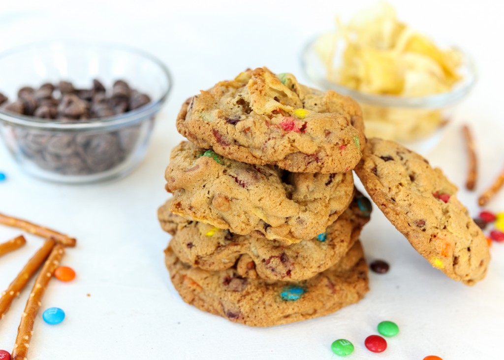- In a medium bowl, sift together the flour, baking powder, baking soda and salt. Add the butter to the large bowl or bowl of a stand mixer that has the bacon fat already in it. Add the remaining ½ cup brown sugar and the granulated sugar then beat on medium-high speed for about 2-3 minutes, or until fluffy. Add the egg, egg yolk and vanilla then beat until combined. Add the flour mixture then beat on low until a few flour streaks remaining. Add the pretzels, chocolate chips, M&M’s and candied bacon then beat until just combined. Use a rubber spatula to stir in the potato chips.