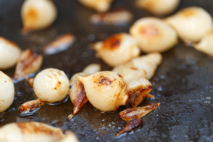 - While the brussels sprouts are in the oven heat a small skillet over medium heat. Sauté the shallot until caramelized. Set aside.